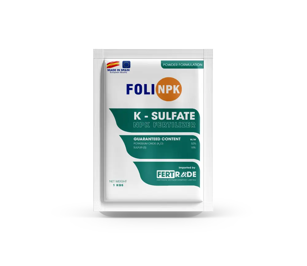FOLI K SULFATE, also known as SOP fertilizer, is a pure drip irrigation fertilizer containing easily absorbed potassium. Potassium Sulphate has the chemical formula K2SO4, ensuring that plants absorb nutrients quickly and effectively. With a high potassium content, it helps plants stop sprouting, increase the ability to flower and bear fruit, nourish tubers and fruits, and increase the quality of agricultural products.