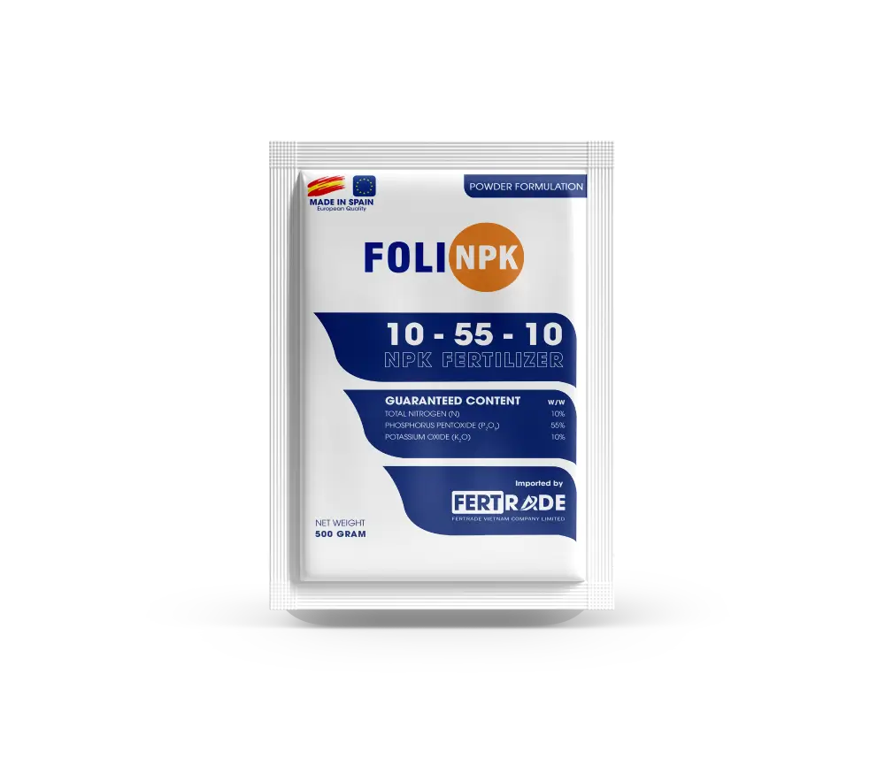 FOLI NPK 10-55-10 là phân bón dạng bột, hoà tan 100% trong nước, tinh khiết, có thể sử dụng cho hệ thống tưới nhỏ giọt, đảm bảo cho cây trồng hấp thu dinh dưỡng một cách nhanh chóng và hiệu quả, với thành phần Lân cao giúp kích rễ cây con, chặn đọt, làm già lá, kích ra hoa, tạo mầm hoa, hình thành trái, tăng khả năng đậu trái.