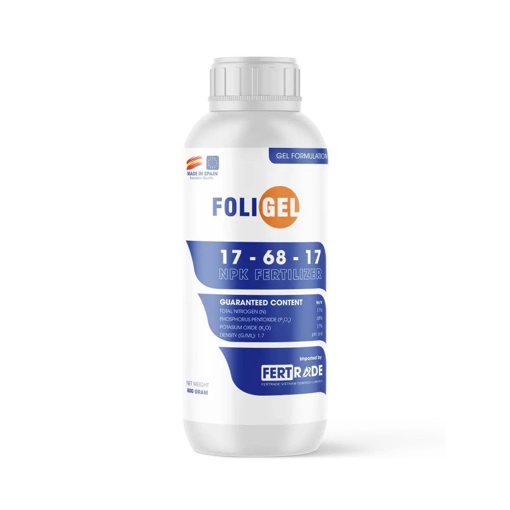 FOLIGEL 17-68-17 + TE là phân bón dạng gel, hoà tan 100% trong nước, tinh khiết, có thể sử dụng cho hệ thống tưới nhỏ giọt, đảm bảo cho cây trồng hấp thu dinh dưỡng một cách nhanh chóng và hiệu quả, với thành phần Lân cao giúp kích rễ cây con, chặn đọt, làm già lá, kích ra hoa, tạo mầm hoa, hình thành trái, tăng khả năng đậu trái.